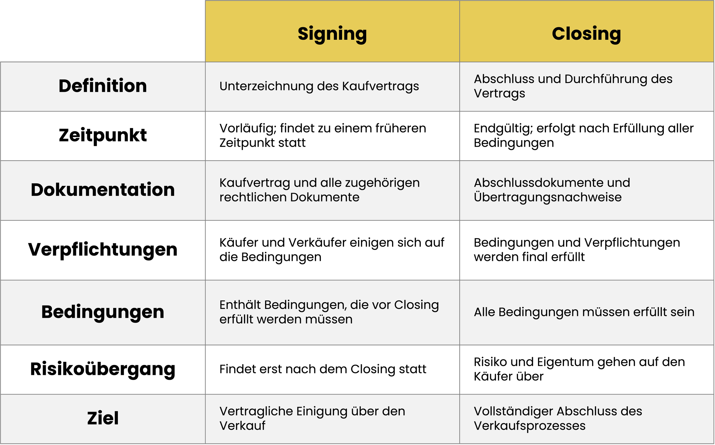 Dieser Schritt symbolisiert die Einigung über die Bedingungen der Transaktion. Zum Zeitpunkt des Signing haben Käufer und Verkäufer die Due-Diligence-Prüfung abgeschlossen, die Vertragsbedingungen ausgehandelt und sich auf den Preis geeinigt. Grundlegend ist, dass das Signing nicht zwangsläufig den unmittelbaren Übergang von Eigentum oder die Zahlung des Kaufpreises bedeutet.